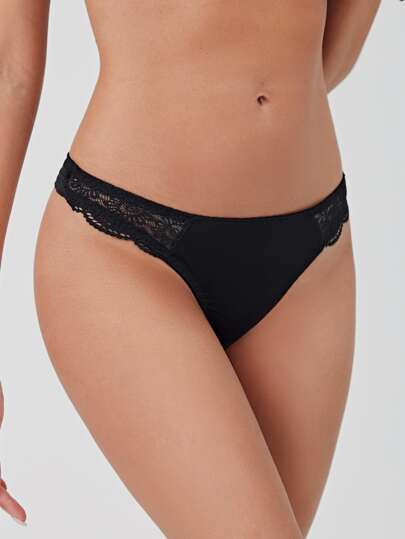 Ocili Contrast Lace Thong Sexy Lingerie Black Panties - Black - View 3