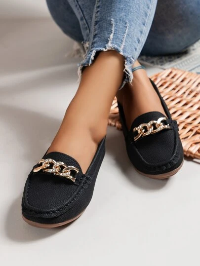 Women's Flat Shoes, New Spring/Summer Black Embossed Slip-On Loafers With Metal Rhinestone Chain Decor, Versatile, Comfortable Outdoor Moccasins - Black - View 1