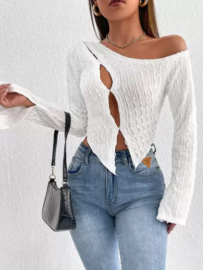 SHEIN PETITE Cut Out Asymmetrical Neck Split Cuff Crop Tee - White - View 1