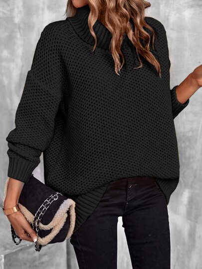 EMERY ROSE Turtleneck Drop Shoulder Pointelle Knit Jumper - Black - View 1