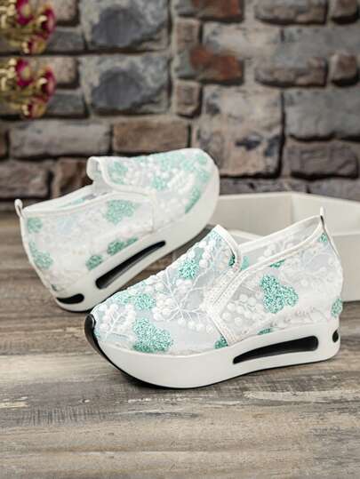 Sporty Wedge Sneakers For Women, Embroidery Detail Slip-on Sneakers - Multicolor - View 1