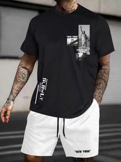 Manfinity Hypemode Men Plus Building & Letter Graphic Tee & Drawstring Waist Shorts - Black and White - View 1