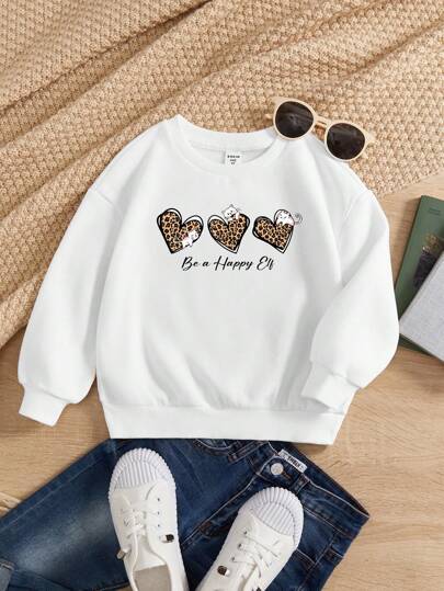 Young Girl Leopard & Heart Print Thermal Lined Sweatshirt - White - View 1