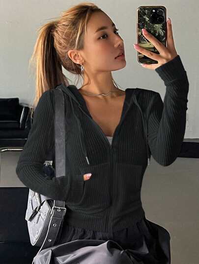 DAZY Zip Up Drawstring Hooded Sweatshirt,Long Sleeve Tops Jacket - Black - View 1