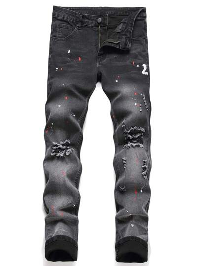 Manfinity Homme Men Splash Ink Print Ripped Frayed Bleach Wash Jeans, Plain Slim Fit Long Dark Grey Cargo Jeans, For Husband, Boyfriend Gifts, Men Paint Splatter Jeans, Men Ripped Jeans, Men Distressed Jeans - Black - View 1
