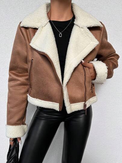 EURMUSE Fuzzy Oversized Collar Zipper Closure Women's Jacket - Camel - View 5