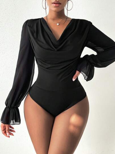 VaVaBold Women's Solid Color Ruffled Collar & Cuff Elegant Fashionable Bodysuit - Black - View 1