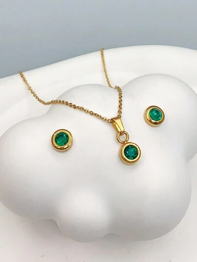 3pcs/Set Fashion Women's 18K Gold Plated Stainless Steel Round Cubic Zirconia Necklace And Earrings Set. Suitable For Christmas, New Year, Birthday, Valentine's Day And Dancing Parties, As Well As Perfect Choice For Wedding, Bohemian Vacation Style,Mom,Mother,Mother's Day,Gift - Green - View 1