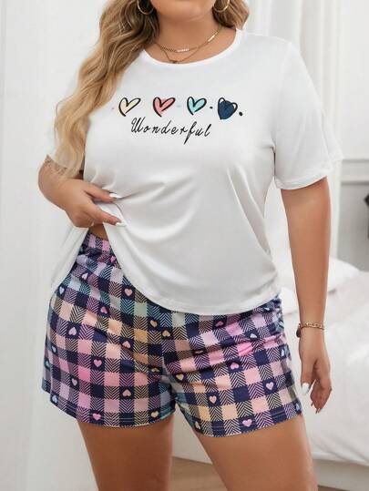 Plus Size Letter & Heart Print Short Sleeve T-Shirt And Shorts Pajama Set - Multicolor - View 1