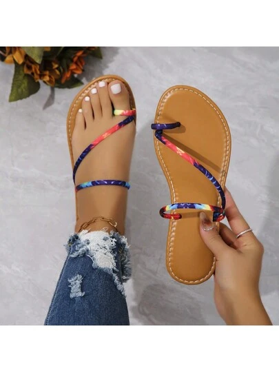 2025 Spring/Summer New Fashion Comfortable Non-Slip Flat Rainbow Strap Plus Size Open Toe Sewn Casual Beach Slippers For Women - Multicolor - View 1