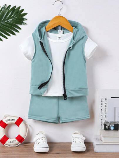 Baby Boys' Simple White Short Sleeve Tee, Lightweight Hooded Vest, Solid Color Sport Shorts - Green - View 1