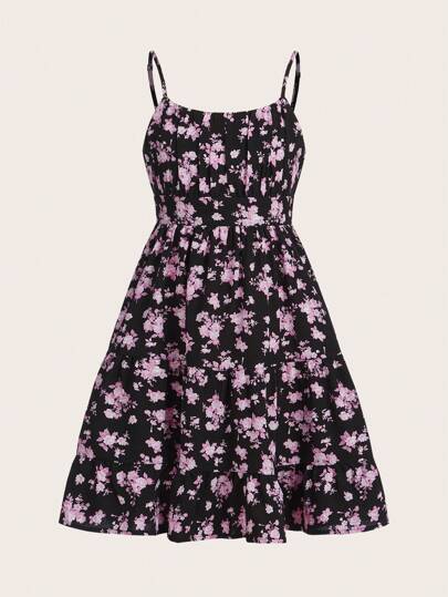 SHEIN Tween Girls' Woven Floral Print Holiday Cami Dress - Black - View 1