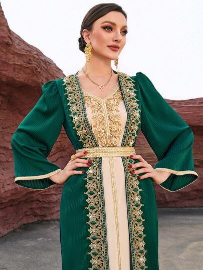Al Najma Dark Green & Apricot Colorblock Heavy Work 2 In 1 Kaftan Modest Long Sleeve Arabian Dress - Multicolor - View 1