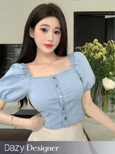 Dazy Designer Women Denim Bubble Sleeve Top With Square Neck And Unique Design - Light Wash - View 1