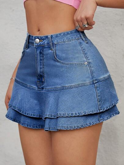 SHEIN ICON Women Two-Layer Ruffle Hem Denim Skirt With Pockets - Light Wash - View 1