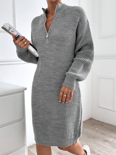 EURMUSE Women Plain Knit Design Knit Dress With Zipper Detail - Grey - View 1