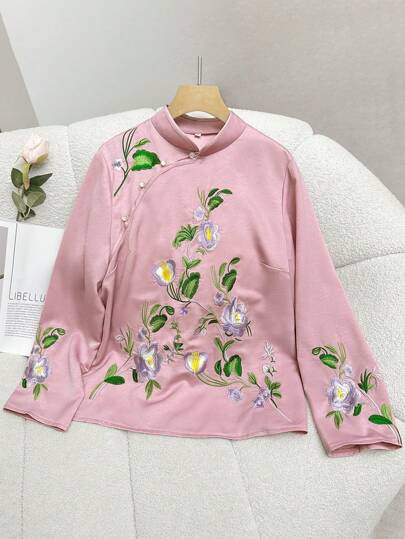 Modelyn Elegant Flower Embroidery Stand Collar Long Sleeve Hanfu Top For Spring, Vintage Classic Tang Suit Hanfu Top - Pink - View 1
