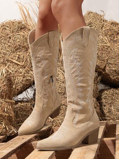 Fall/Winter Women's Velvet Fabric Western Boots, Embroidered, Pointed Toe, Slip-On, Winter, Warm, Side Zipper, Fashionable, Thick Heel, Mid-Calf, Knee-High Boots - Apricot - View 4