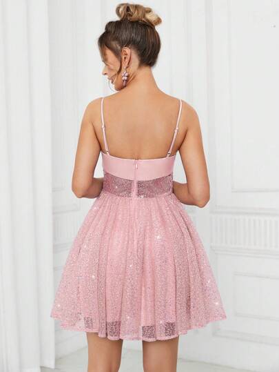 SHEIN Belle Elegant Spaghetti Strap Silver Dot Mesh A-Line Dress With Pleated Hem For Women's Cocktail Party Dress Prom Semi Formal Wedding Guest Dress, For Birthday, Graduation, Homecoming - Pink - View 3