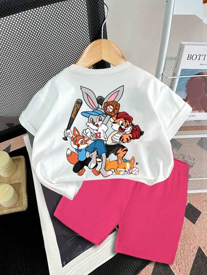 SHEIN Leap Crew Back To School Cute Cartoon Animal Print White Short Sleeve T-Shirt And Pink Shorts Set, Casual Summer Outfit For Baby Girl - Multicolor - View 1