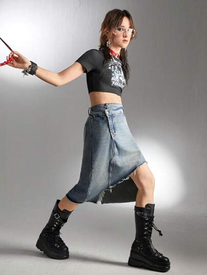 SHEIN Explorewe Teenage Girls' Y2K Asymmetrical Skirt - Light Wash - View 1