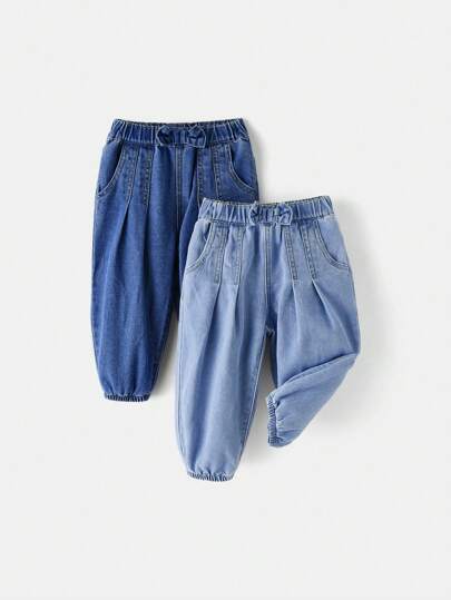 BABY GIRL Cute Casual Bow Detail 2pcs Set Tapered Cuffed Jeans - Medium Wash - View 1