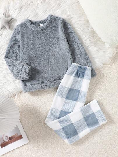 Tween Girl Warm Plush Checkered Top And Pants Set, Casual Homewear, Fall/Winter - Dusty Blue - View 1