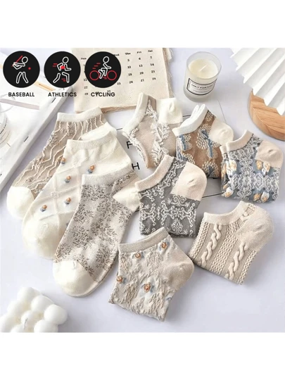 Sports Outdoor 9 Pairs Retro Textured Socks, Comfy & Breathable Boat Socks, Women's Socks - Multicolor - View 1