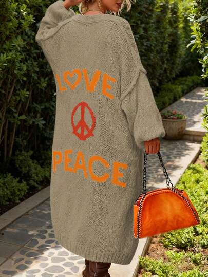 Fashionable New Autumn/Winter Tops, Featuring Letter Print, Contrast Stitching, Color Block, Colors, Pattern, Long Sleeve Sweater, Women's Casual Oversized Cardigan, Suitable For Outerwear - Khaki - View 1