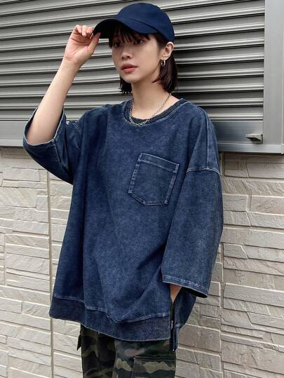 FRIFUL Women Simple Solid Color Round Neck Loose Slit Hem Sweatshirt - Blue - View 7