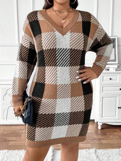 Plus Size Women V-Neck Plaid Casual & Work Sweater Dress, Autumn/Winter - Multicolor - View 1