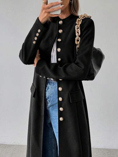 SHEIN Clasi Stand Collar Single-Breasted Long Overcoat - Black - View 1