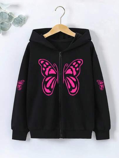 Tween Girl Casual Long Sleeve Zip-Up Butterfly Hooded Sweatshirt, Suitable For Autumn And Winter, Tween Girl Clothing - Black - View 1