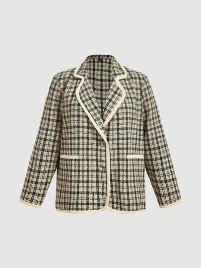 SHEIN MOD Plus Size Women Green Plaid Tweed Vintage Style Contrast Trim Blazer Jacket - Multicolor - View 1
