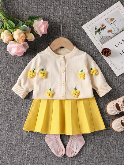 SHEIN Baby Girl 3D Grape Decor Long Sleeve Cardigan And Knit Pleated Skirt 2Pcs Set, Autumn - Yellow - View 1