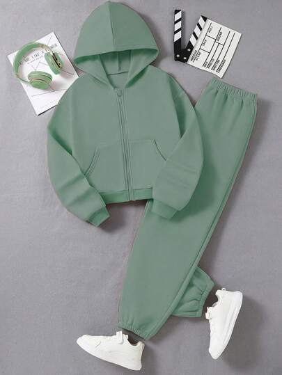 2pcs/Set Teen Girl Plain Front Zip Hoodie Top With Pocket & Pants Casual Tracksuit - Green - View 1