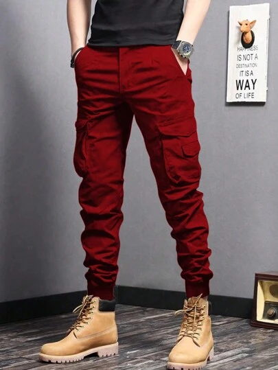 SHEIN Tween Boy Casual Cargo Pants With Multiple Pockets - Red - View 1