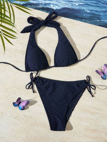 Fashion Special Fabric Solid Color Bikini Set Swimwear, For Summer Beach Vacation - Blue - View 1