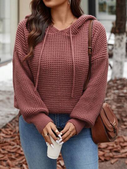 SHEIN Frenchy Plus Size Women Plain Bat Sleeve Long Sleeve Casual Hooded Sweater, Autumn - Dusty Pink - View 1
