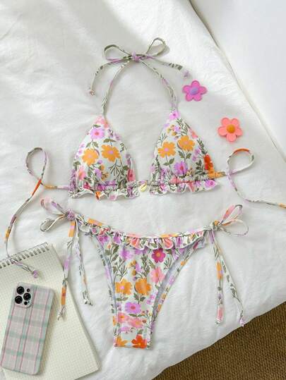 SHEIN Swim Random Print Women Sweet Floral Pattern Ruffle Shell Pendant Tie-Front Bikini Set Summer - Multicolor - View 1