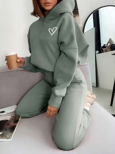 INAWLY 2pcs/Set Women Heart Printed Long Sleeve Cropped Hoodie & Drawstring Waist Pocketed Jogger Pants Sweatsuit - Green - View 1