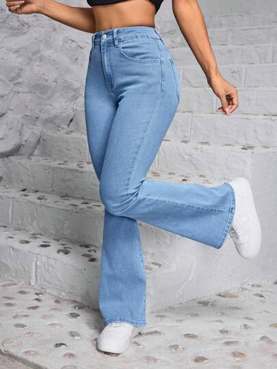 SHEIN PETITE Women Front Button Pocket Simple Denim Jeans, Casual Daily Wear - Light Wash - View 1