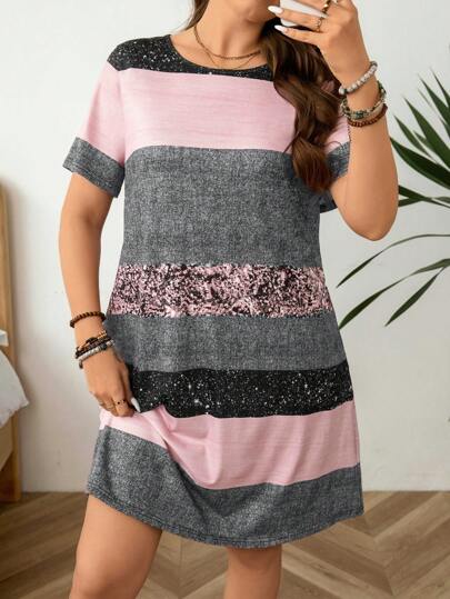 SHEIN LUNE Plus Size Women Colorblock Crew Neck Short Sleeve Casual Dress Summer/Spring Spring Break Sundress Summer Outfits Casual Dress - Multicolor - View 1