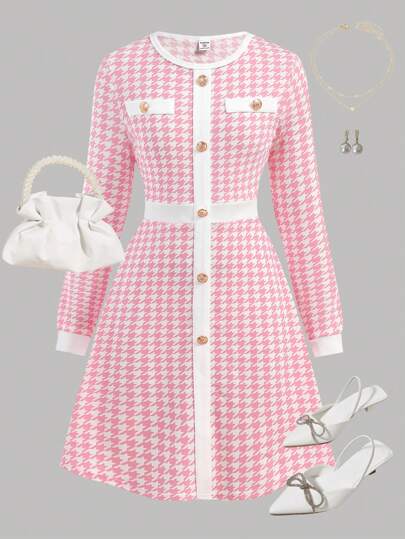 SHEIN Girlism Vintage Houndstooth Print Classic Fashion Elegant Long Sleeve Dress For Teen Girls, Office Commute - Pink - View 1