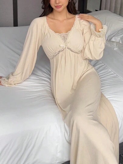 DAZY Lace Patchwork Surplice Front Ruffle Sleeve Nightgown Pajama - Apricot - View 1