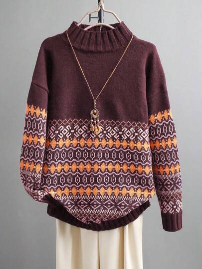 SHEIN LUNE Women's Vintage Casual Knitted Colorblock Jacquard Pullover Sweater, Suitable For Halloween, New Year, Valentine's Day, Thanksgiving, Christmas, Easter, Parties, New Year's Eve - Maroon - View 1