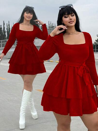 POPSWAY Plus Size Textured Knit Patchwork Woven Maxi Long Sleeve Dress - Red - View 1