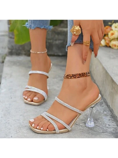 Women's New Arrivals Fashionable Sexy Summer Slip-On High Heel Sandals, Glitter Rhinestone Strap Sandals, Glamorous Crystal Wedge Platform Sandals, Round Toe Slip-On Rhinestone Sandals, Soft Padded Insole, Lightweight & Comfortable, 3.5" Slim Heel, Suitable For Summer/Casual/Outing/Party/Queuing - Gold - View 1
