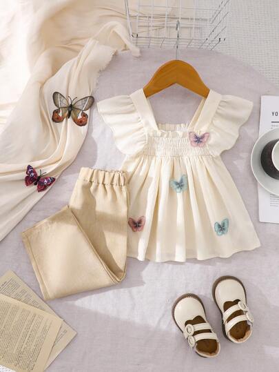 SHEIN 2pcs/Set,Baby Girl Spring&Summer Casual Butterfly Shape Embroidery Sleeveless Top&Solid Long Pants - Apricot - View 1