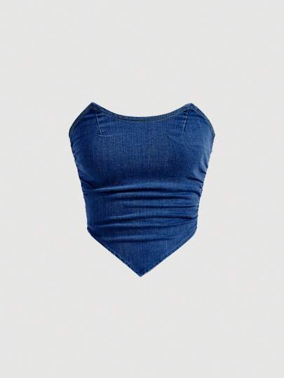 SHEIN MOD Hanky Hem Denim Tube Blue Breast Cup Tight Fit Top - Dark Wash - View 1